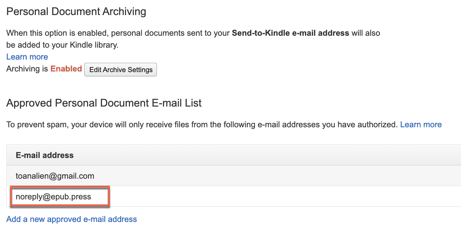 - Cấu hình email gửi trên Amazon cho Kindle như hướng dẫn này https://akishop.com.vn/huong-dan-gui-sach-vao-cac-thiet-bi-kindle-bang-mail-nd49058.html với approved e-mail address là noreply@epub.press.