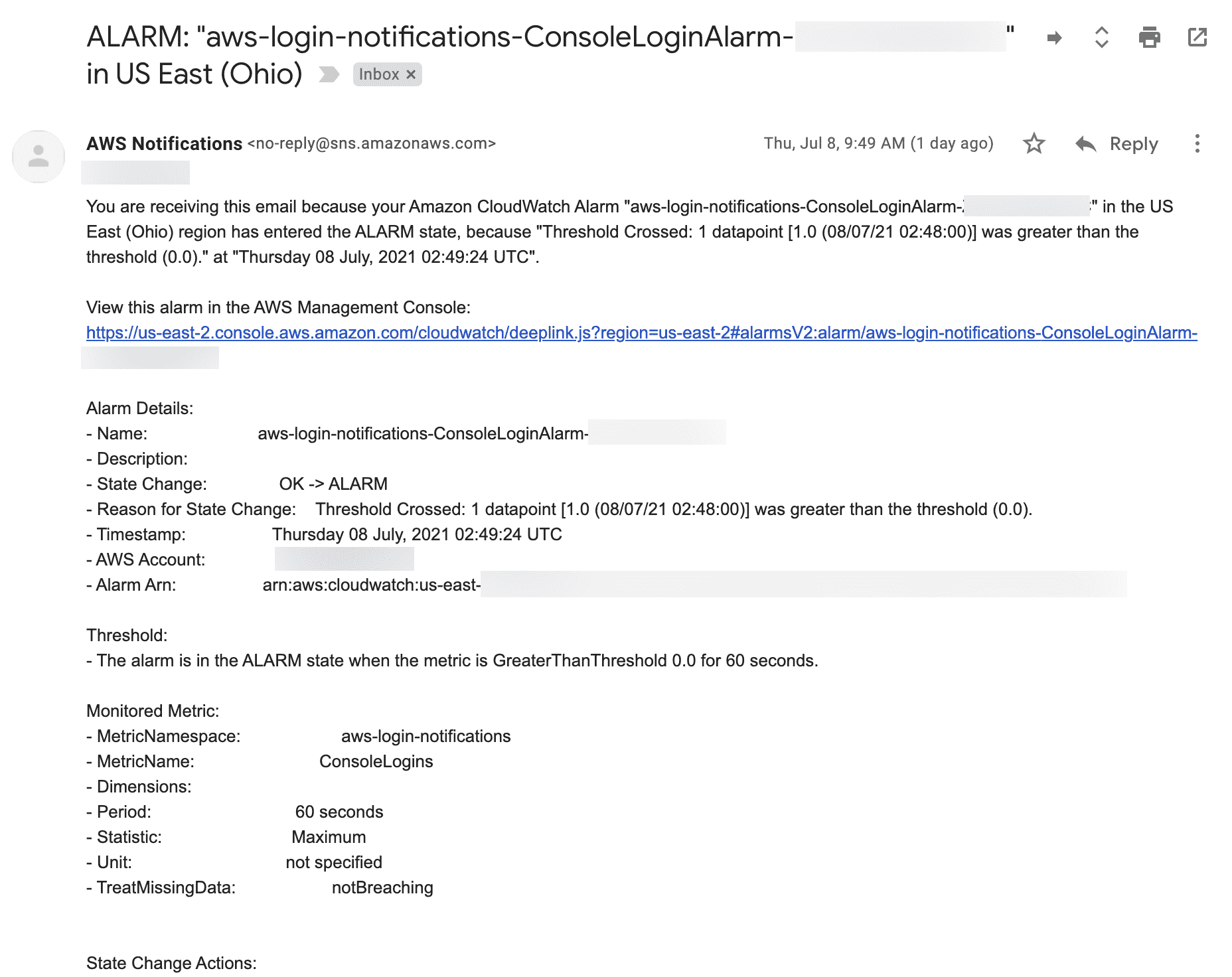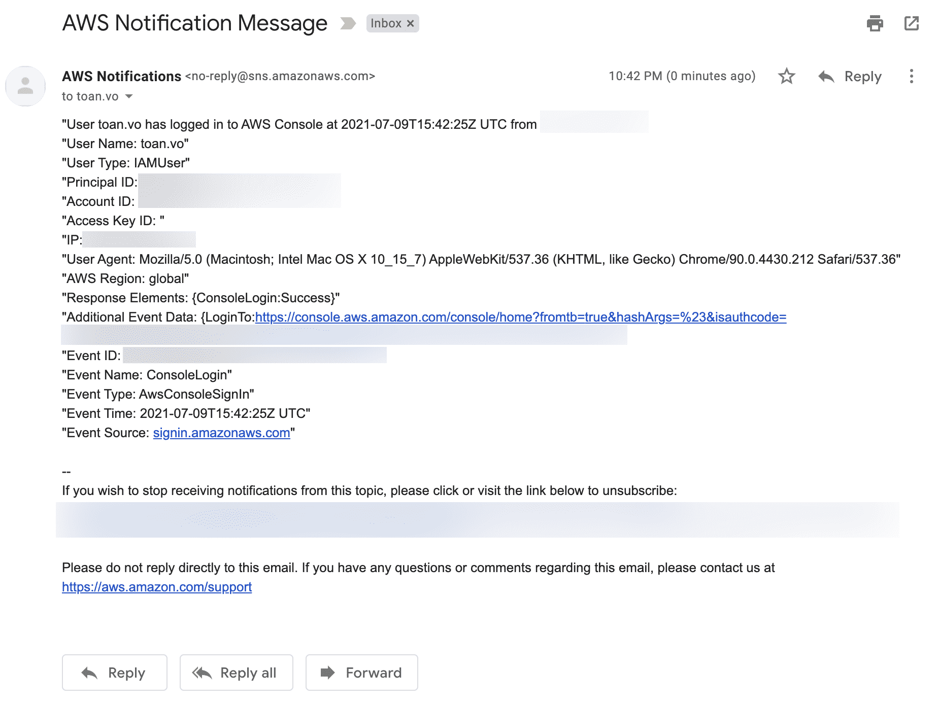 {"accessKeyId":"$.detail.userIdentity.accessKeyId","eventID":"$.detail.eventID","awsRegion":"$.detail.awsRegion","responseElements":"$.detail.responseElements","sourceIPAddress":"$.detail.sourceIPAddress","eventSource":"$.detail.eventSource","principalId":"$.detail.userIdentity.principalId","userAgent":"$.detail.userAgent","eventType":"$.detail.eventType","userName":"$.detail.userIdentity.userName","additionalEventData":"$.detail.additionalEventData","accountId":"$.detail.userIdentity.accountId","eventTime":"$.detail.eventTime","eventName":"$.detail.eventName","userType":"$.detail.userIdentity.type"}"User <userName> has logged in to AWS Console at <eventTime> UTC from <sourceIPAddress>."