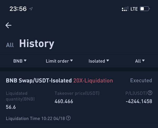 Vẫn là với BNB/USDT, lúc này sàn lag không cho giao dịch luôn, cứ thế để cháy.