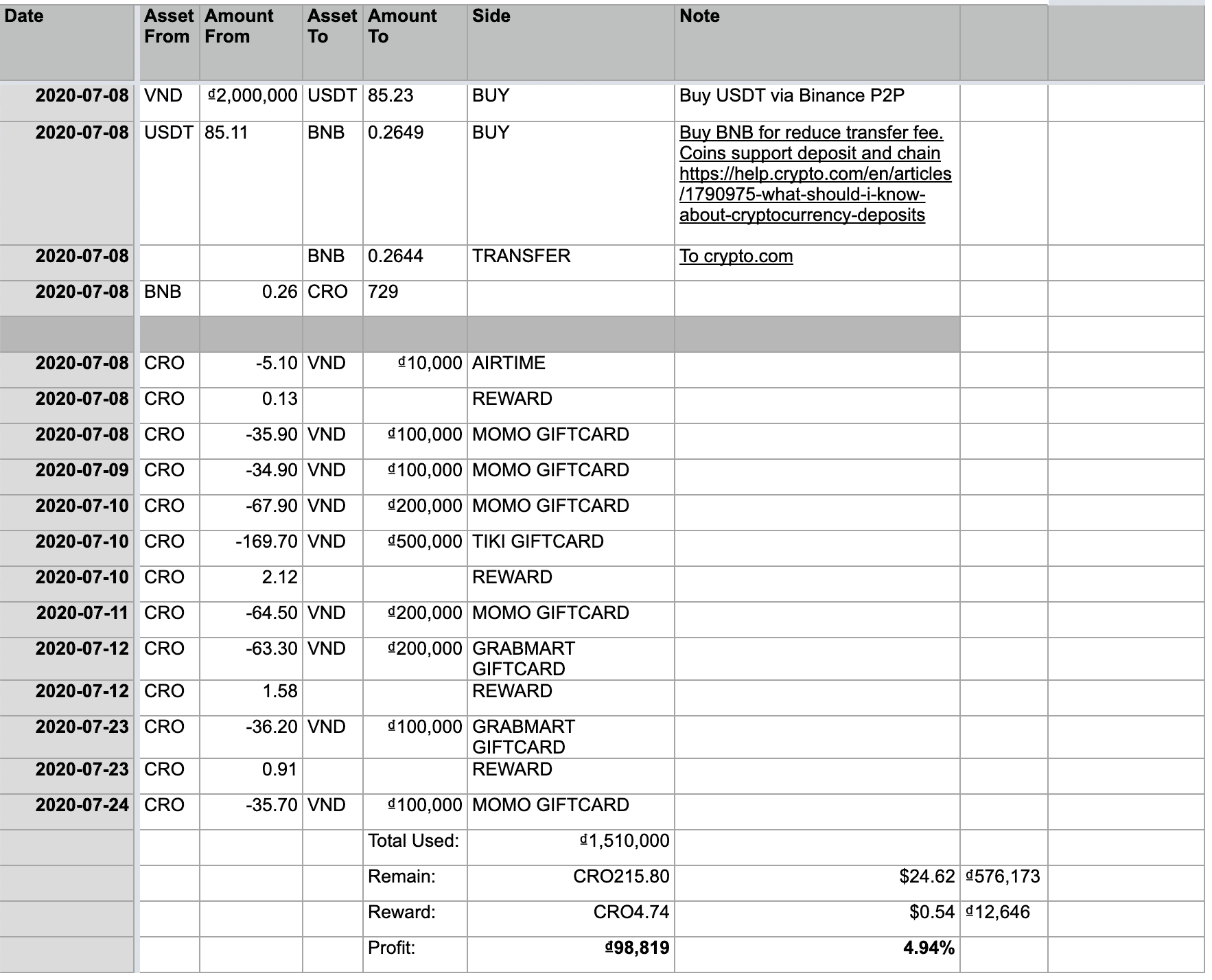 Mình thử với 2,000,000đ mua USDT ở Binance P2P sau đó mua BNB để chuyển vào Crypto App (dùng BNB để giảm phí transfer, tham khảo ở https://help.crypto.com/en/articles/1790975-what-should-i-know-about-cryptocurrency-deposits). Sau khi deposit vào Crypto App, mình mua CRO bằng BNB, sau đó đi mua giftcard.